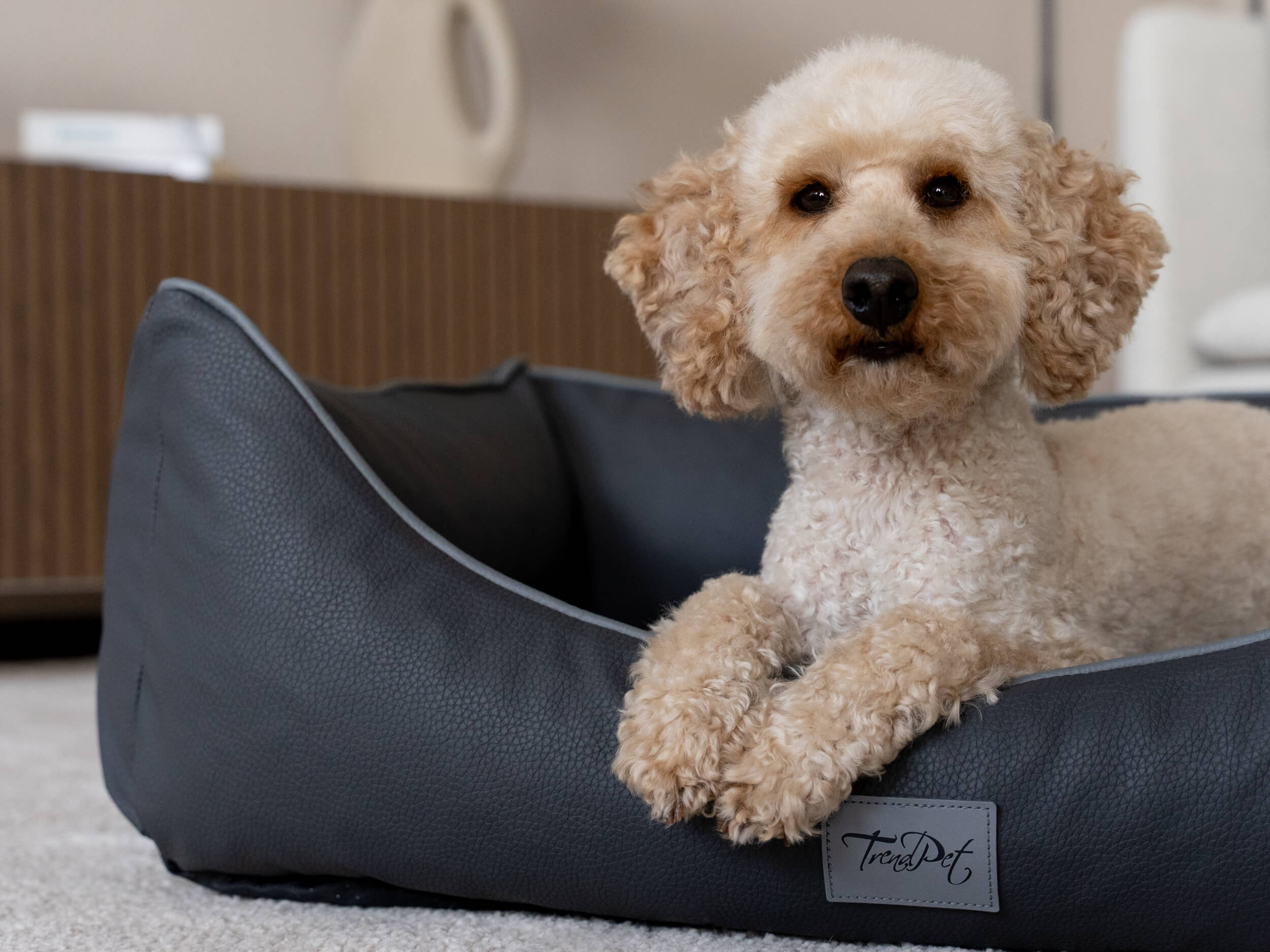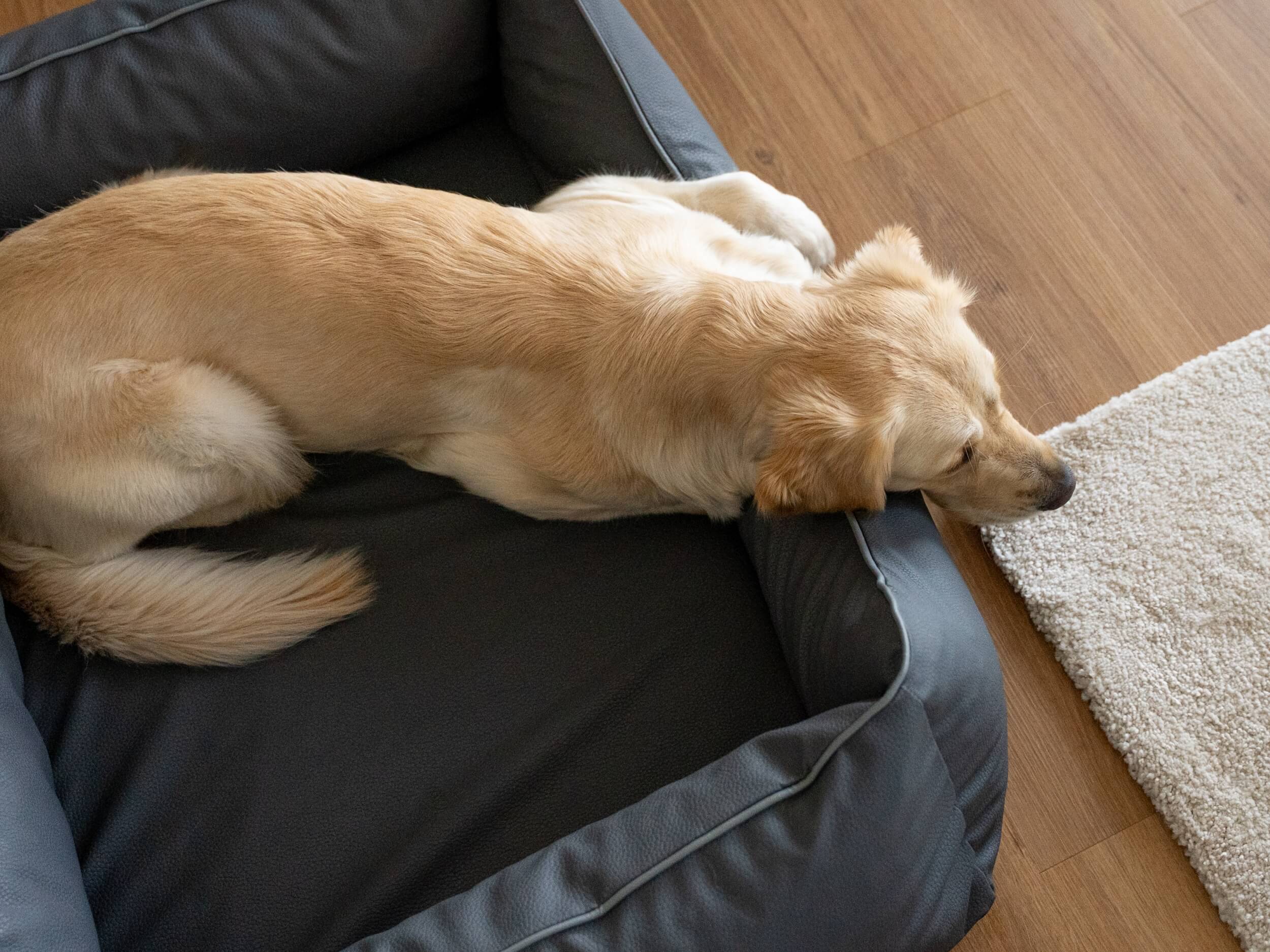 Das Hundebett Runa hat eine strukturierte Oberfläche aus Kunstleder, ist pflegeleicht und richtig bequem dank der Matratze aus 100 % Memory Foam.