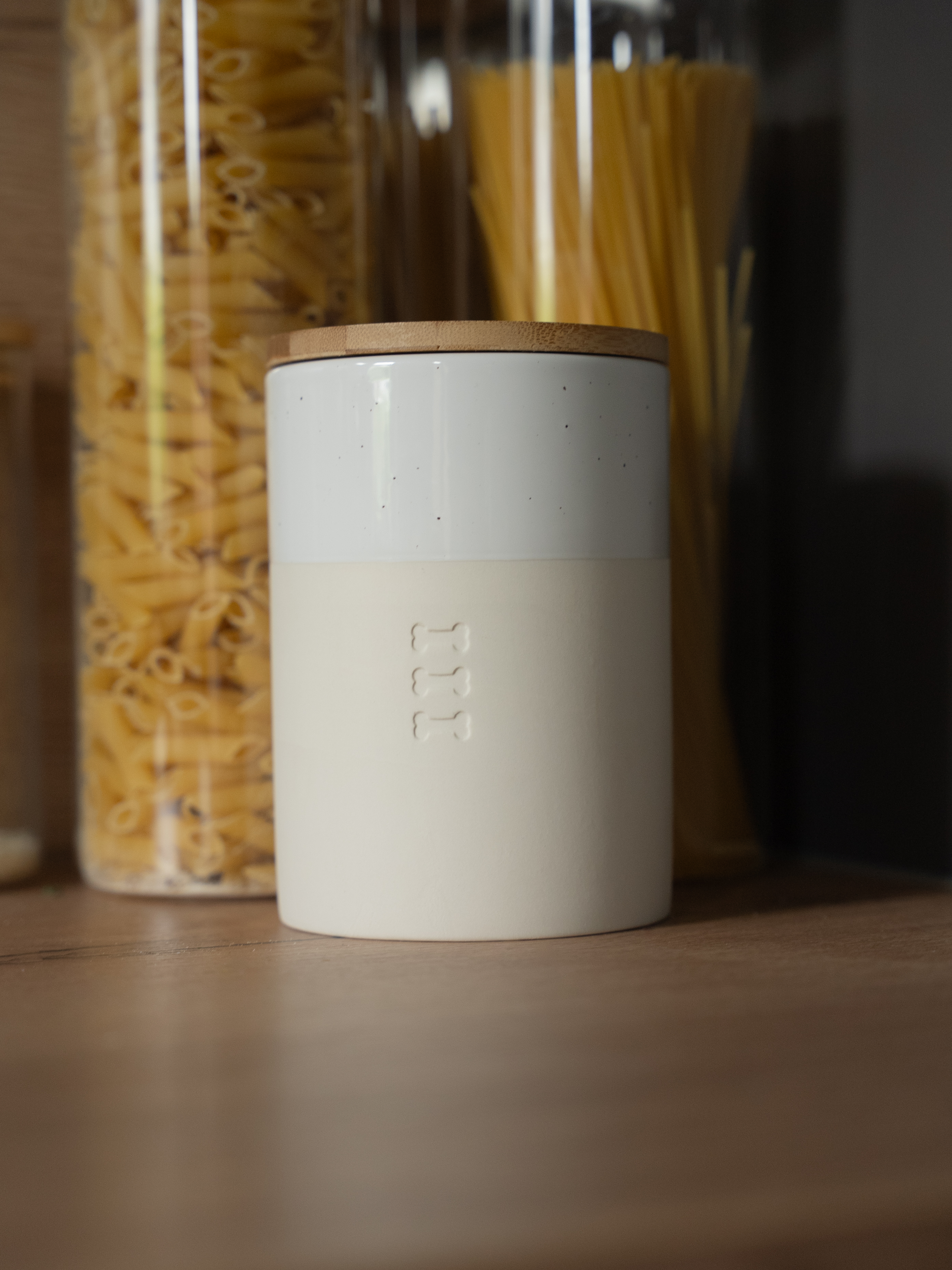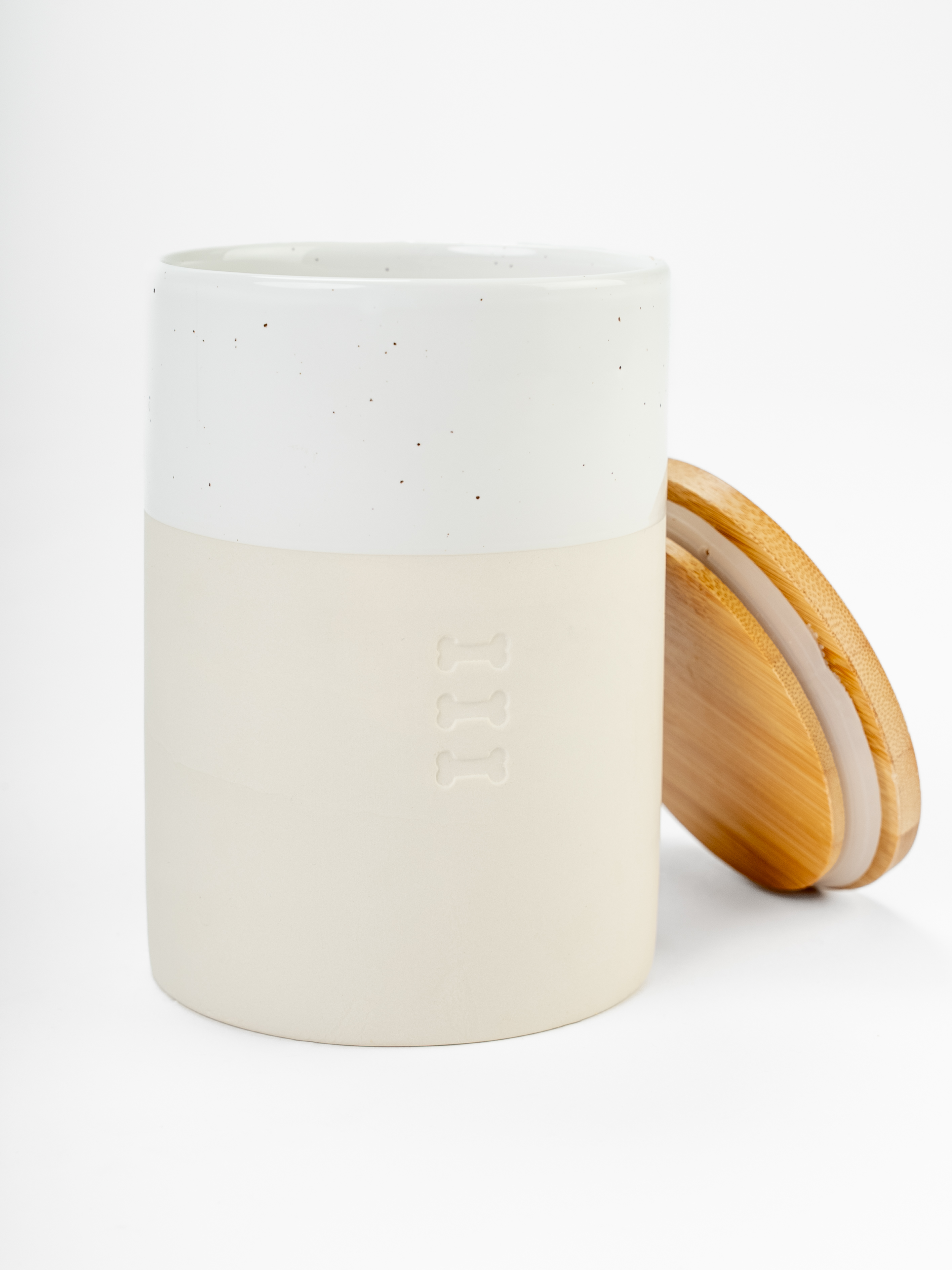 Das beigefarbene Porzellan mit weißer Glasur und feinen schwarzen Punkten macht die Clay-Leckerlidose dezent und stilvoll für Küche oder Futterplatz.